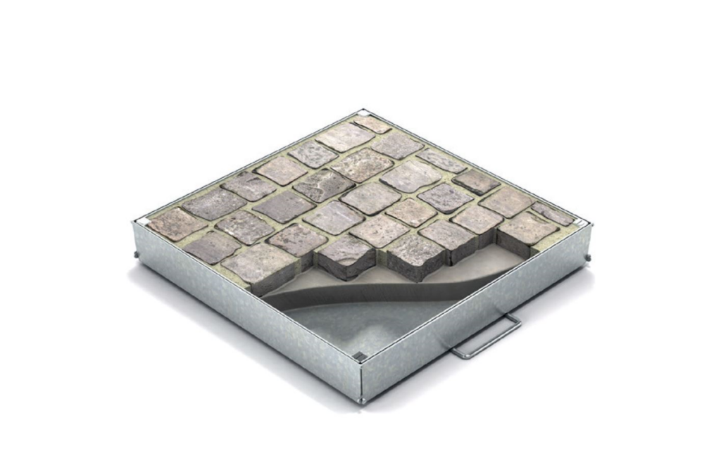 Cubic is a ground access cover designed for cobblestone and stone pavements, integrating discreetly with granite, natural stone, and similar surfaces. Its robust construction ensures high strength and safe access to underlying installations such as electrical, plumbing, and technical systems.